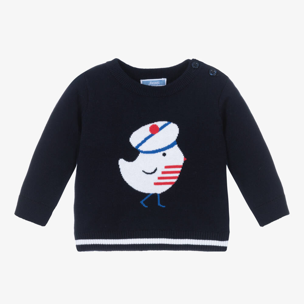 Navy blue sweater for younger boys by French brand Jacadi Paris, knitted in soft organic cotton. On the front is a lovely intarsia bird wearing a white beret and red stripy top. It has softly ribbed trims with a white stripe on the hem. Shoulder buttons ensure easy fastening when dressing.