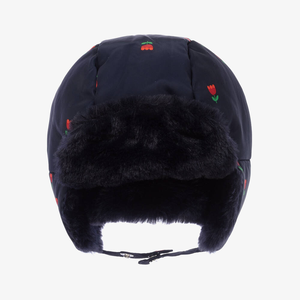 Cute navy blue trapper hat for little girls by Jacadi Paris, with a red and green tulip print. Providing excellent protection in cold weather, it has a silk smooth exterior, with faux fur trim and a cosy polar fleece lining. It is lightly padded with Repreve® recycled polyester for added warmth and secures with an adjustable, popper-fastening chin strap.