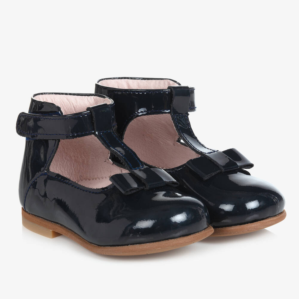 Lovely for younger girls, a pair of navy blue patent leather shoes by Jacadi Paris. Classically styled, these smart T-bar shoes have padded cushioning above the heel and a beautifully soft leather lining. There are sweet decorative bows on the front and easy-to-fasten velcro straps on the ankle. The non-slip rubber sole helps to keep them safe when taking little steps.