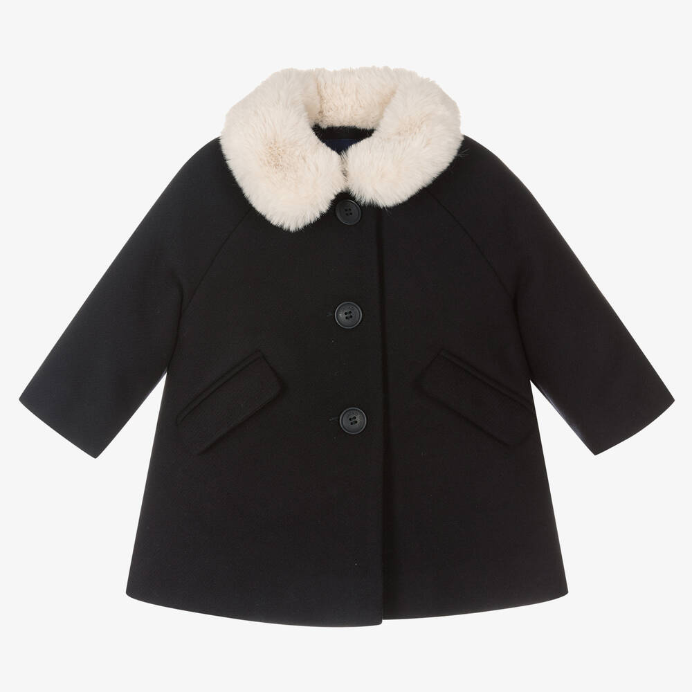 Smart navy blue coat for little girls by traditional French brand Jacadi Paris, with a super soft ivory faux fur collar. Made in a mid-weight wool blend, it has front flap pockets and large logo button fastenings on the front. It is lined in silky navy blue satin for comfort.