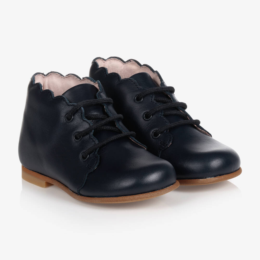 Navy blue leather lace-up ankle boots for little girls by Jacadi Paris, with lovely scalloped detailing. They are lined in soft leather for comfort and cushioned at the ankle, tongue and insole for extra support when taking those little steps. Smaller sizes have flexible rubber outsole and firm outsole with rubber patch on the heels for larger sizes.
