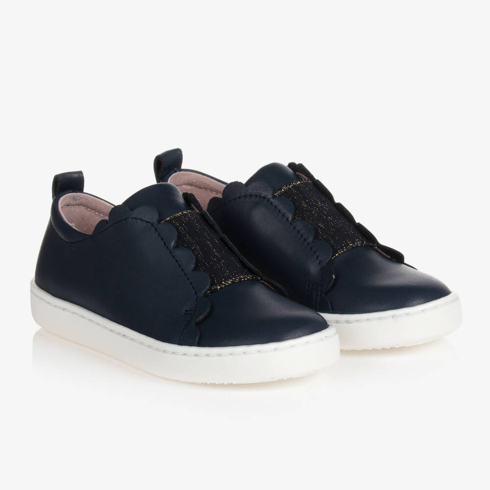 Girls navy blue leather slip-on sneakers by Jacadi Paris. Made in premium quality leathers, they have a scalloped edge and a padded tongue with a gold and blue elasticated panel to keep them on securely. There is a heel pull and they are fully lined in pink leather, with a matching leather inner sole. The white rubber outer soles are non-slip for a secure grip.