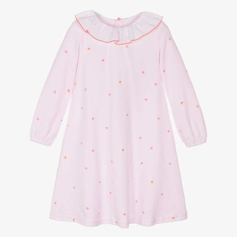 Sweet pink nightdress for girls by Jacadi Paris, made in lightweight organic cotton velour. Fastening with poppers on the back, it has an all-over pink polka dot print and a dramatic ruffle collar, trimmed with neon pink piping.