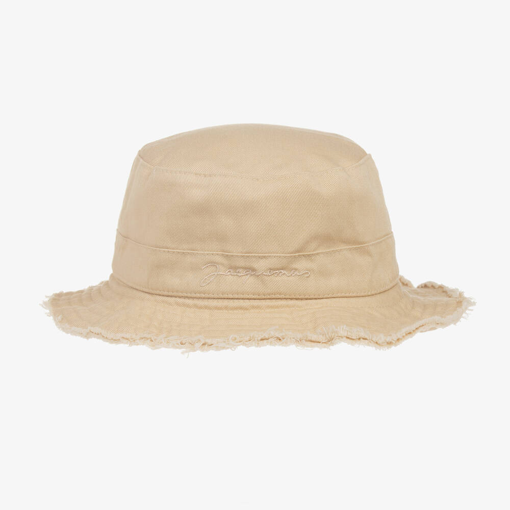 Inspired by the main collection, a beige cotton bucket hat for boys and girls by French brand Jacquemus Enfant. For a signature look the designer's name can be seen on the front in tonal embroidery. Fully lined for comfort, it is finished with cool, frayed edges for a modern contemporary look.