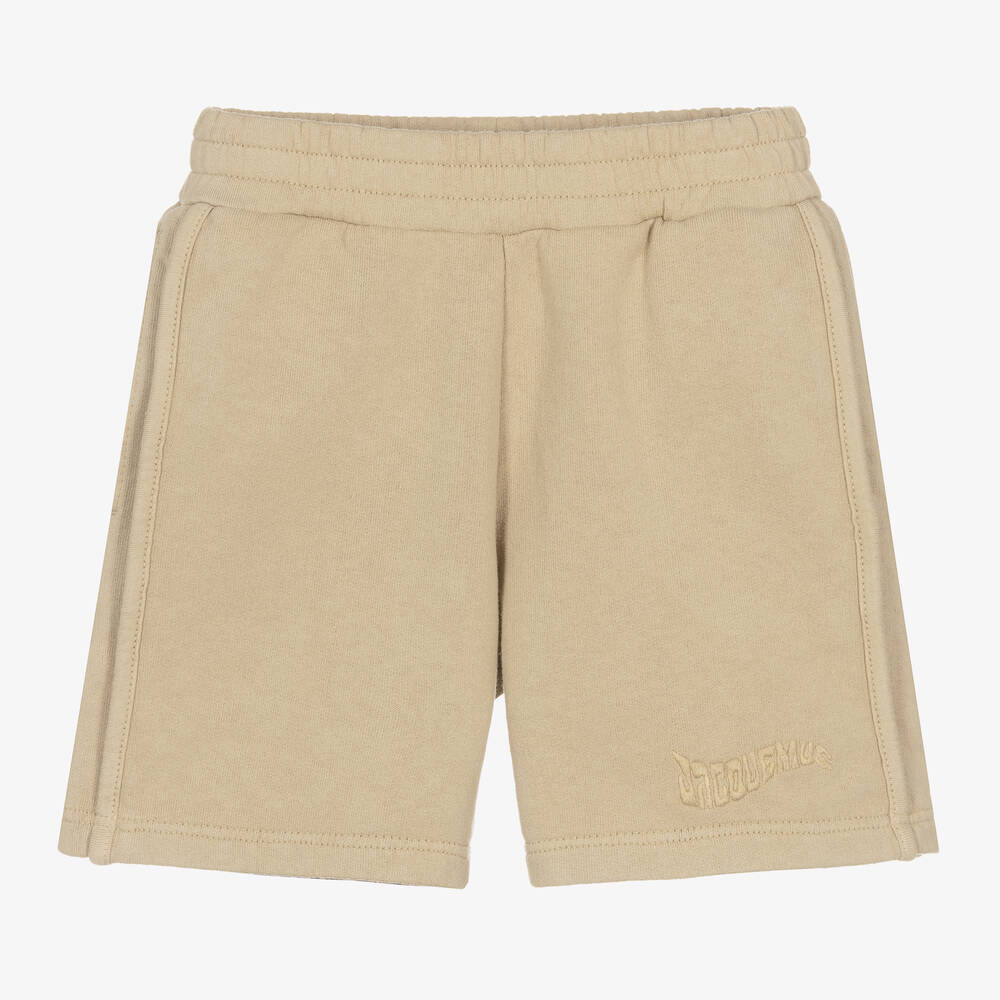 Casual Bermuda length beige shorts for boys and girls by French brand Jacquemus Enfant. Relaxed fitting for effortless comfort and style, they are made in mid-weight cotton jersey, with an elasticated ribbed waist for an ideal fit. There are useful side seam pockets, with an additional pocket on the back. A tonal embroidered logo on one leg adds a subtle designer touch.