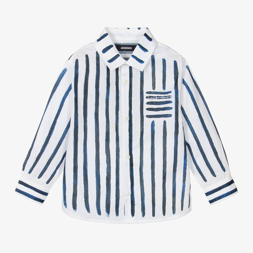 Super stylish for boys, a Mini-me white and blue cotton shirt by French luxury brand, Jacquemus Enfant. Soft and lightweight, it has a placement painted stripe pattern with contrasting stripes on the chest creating a 'pocket' effect. Designed with a relaxed fit and long sleeves, it has a classic collar and fastens with buttons on the front and cuffs. An embroidered white logo on the chest completes the look.