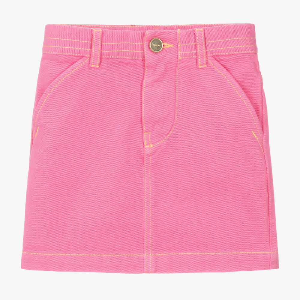 Eye-catching denim skirt for girls by Jacquemus Enfant, in the designer's distinctive pink shade with contrast yellow stretching. Made with soft cotton, it has a straight fit and slanted front pockets. The waistband is adjustable for comfort and the skirt fastens with a zip and branded button. A branded jacron on the back adds a signature designer touch.