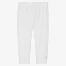 White organic cotton leggings for baby boys from Jamiks. Soft and stretchy, these comfortable full-length leggings have a cute moonlit night-themed pattern in shades of blue and beige.
