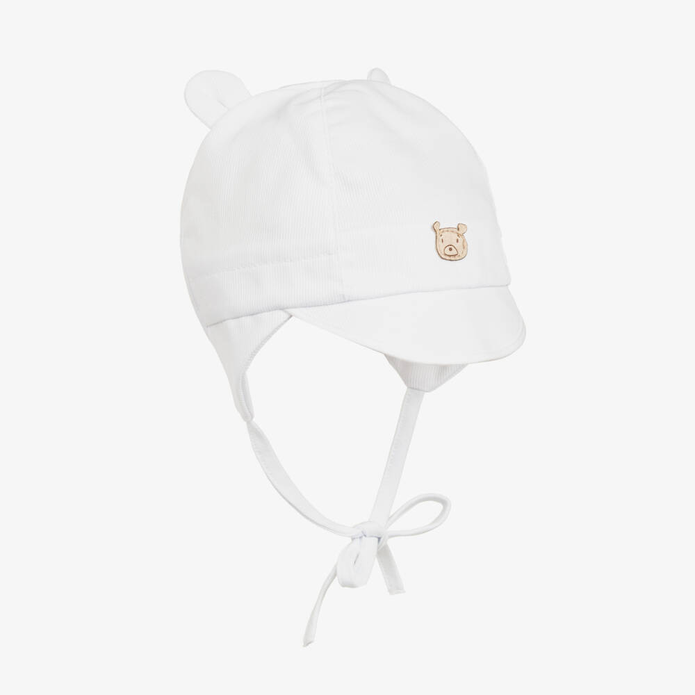 A cute white cap for baby boys by Jamiks, made in textured organic cotton. It has an adorable teddy bear appliqué on the front and little 3D ears on the top, with ties to fasten under the chin. An integrated peak shields delicate eyes and there is a jersey panel on the back for additional stretch and comfort.