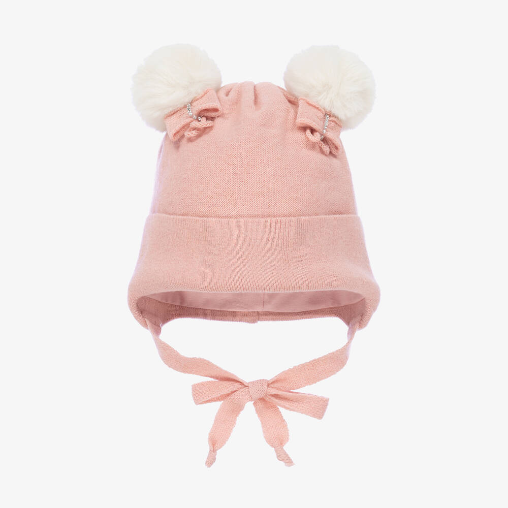 Sweet pale pink hat for baby girls from Jamiks, knitted in a soft wool blend. Lined with smooth cotton jersey it is cosy against delicate skin and has a tie under the chin to ensure it stays in place. There are two faux fur pom-poms on the top with pretty bows finished with diamanté, for a touch of sparkle and a glamorous finish.