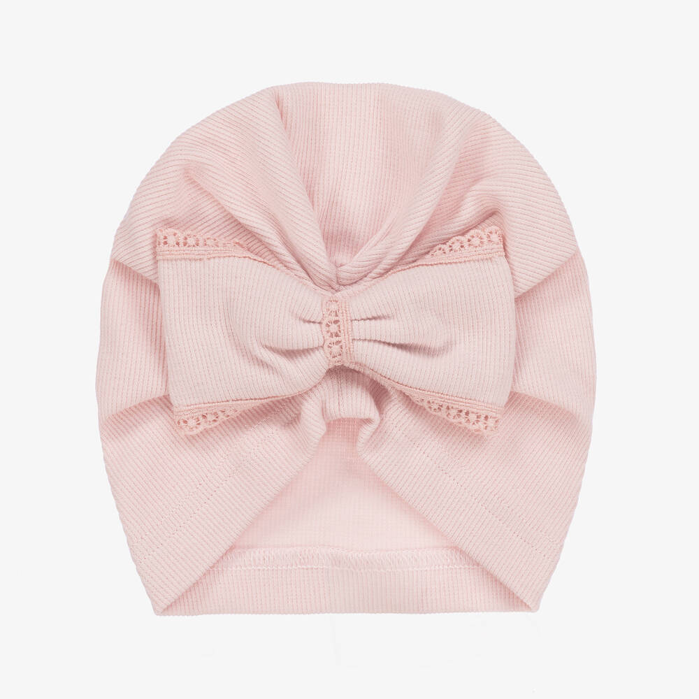 A sweet light pink turban for baby girls by Jamiks, made from soft and stretchy cotton jersey. Designed with style and comfort in mind, this ribbed hat has a decorative bow on the front with pretty crochet lace trims.