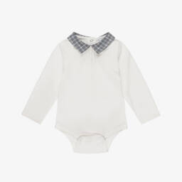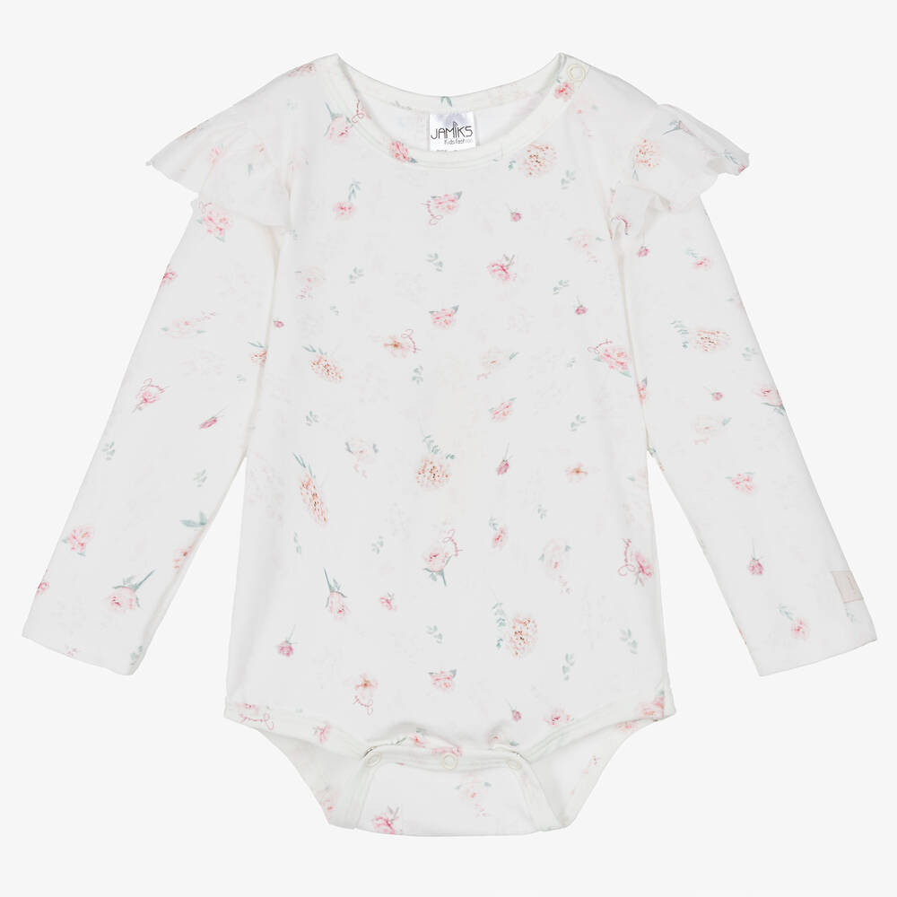 A lovely white bodysuit for baby girls by Jamiks, made in soft organic cotton jersey. It is patterned in a beautiful pink and green floral print, with pretty ruffles over the shoulders. There are easy-fastening poppers on one shoulder and between the legs to help with dressing.