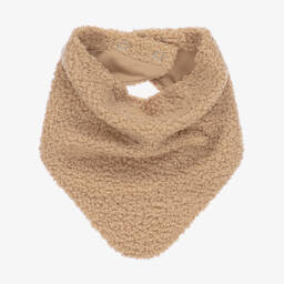 Cosy and comfortable for baby boys and girls, a beige bouclé scarf by Polish brand Jamiks. This bandana-style neck warmer has a soft cotton jersey lining and fastens easily with a single popper behind the neck.
