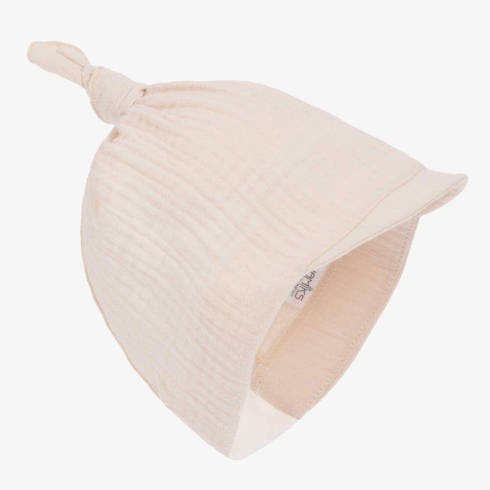 Beige hat for baby boys and girls by Jamiks, made in soft organic cotton seersucker. It has a cute top knot and a wooden teddy bear tile on the front for a sweet finish. Ideal for warmer days, it has a small peak to help protect eyes from the sun and the back is open to keep your little one's head cool.