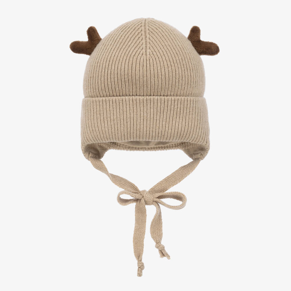 Absolutely adorable, this beige hat for younger boys and girls by Jamiks has sweet velvety brown reindeer ears. Made from a ribbed knit in a wool and cashmere blend, this warm hat is lined in soft cotton jersey for extra comfort. The ties can be fastened under the chin for a secure fit.