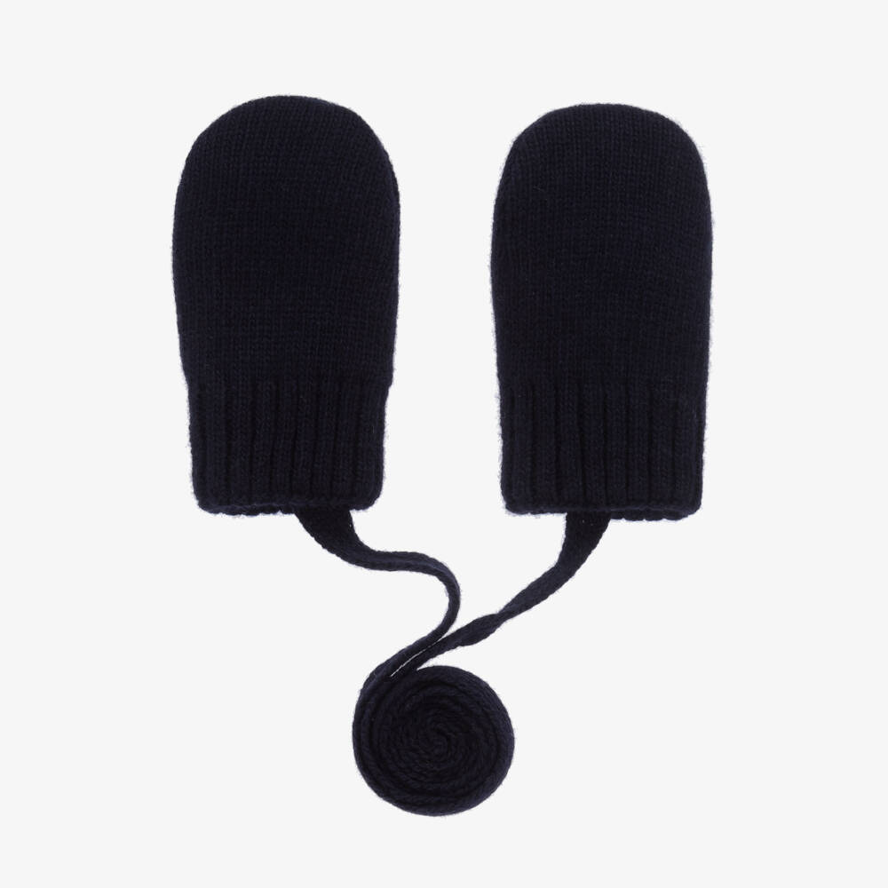 A pair of navy blue mittens for baby boys and girls by Jamiks. So soft and cosy for tiny hands, these mittens are lined with cotton fleece and knitted in a blend with wool and luxurious cashmere. The attached strap threads through the sleeves of their coat or jacket to ensure the mittens do not get lost.