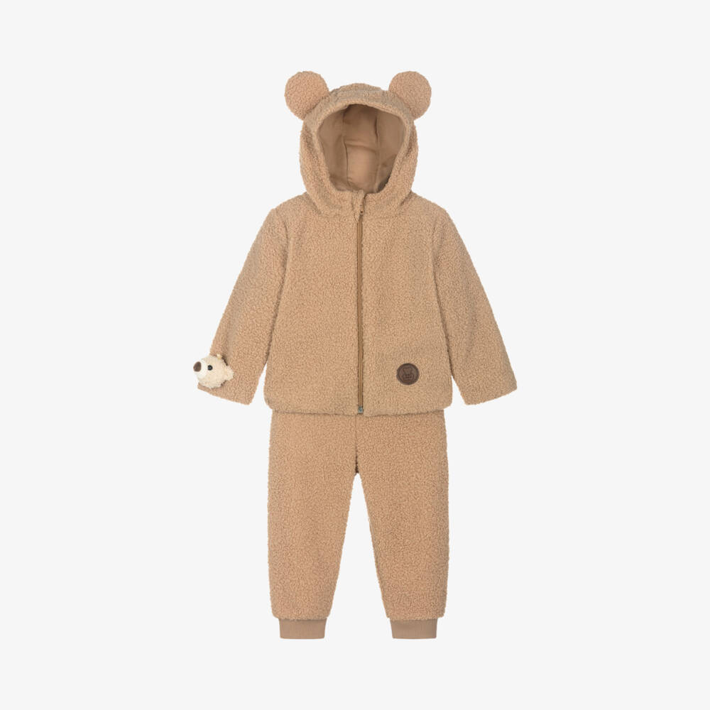 Super cute beige tracksuit for little boys by Jamiks, made in soft bouclé fleece with a teddy bear appliqué on one cuff. The lined hoodie has 3D bear ears, a faux leather bear logo badge and a front zip fastening with a protective chin guard. The matching joggers have a comfortable, elasticated waistband and ribbed cuffs.