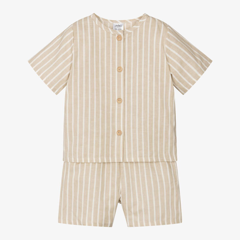 Beige and white striped shorts set for boys by Jamiks, made in a lightweight linen and cotton blend, ideal for warmer days. The short-sleeved top fastens with wooden buttons and the matching shorts have an elasticated waistband for comfort and ease.