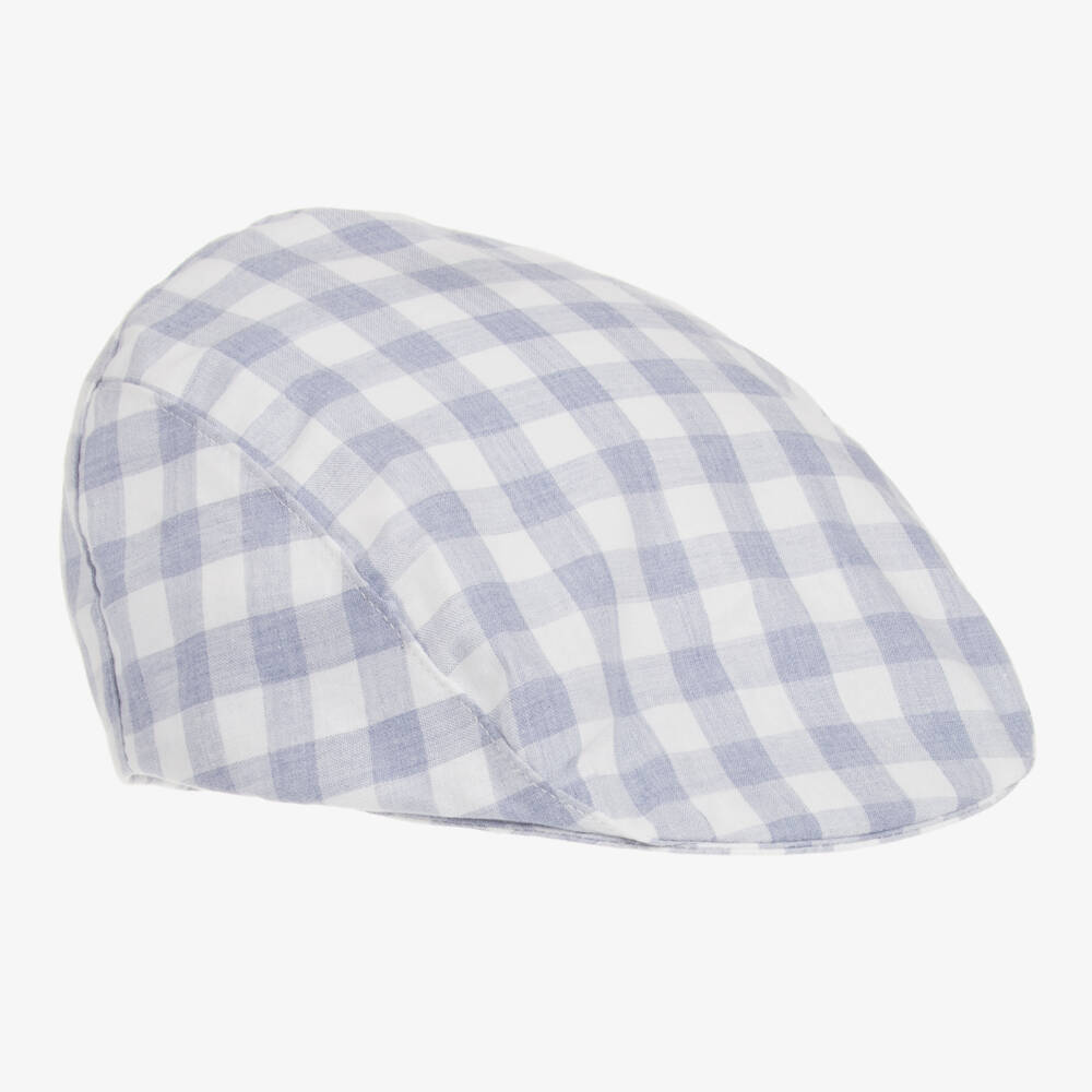 Light blue flat cap for boys by Jamiks, made in smooth cotton twill. It has a small peak to help keep the sun out of eyes and a checked pattern for a traditional finish. The back is lightly elasticated for a secure, comfortable fit.