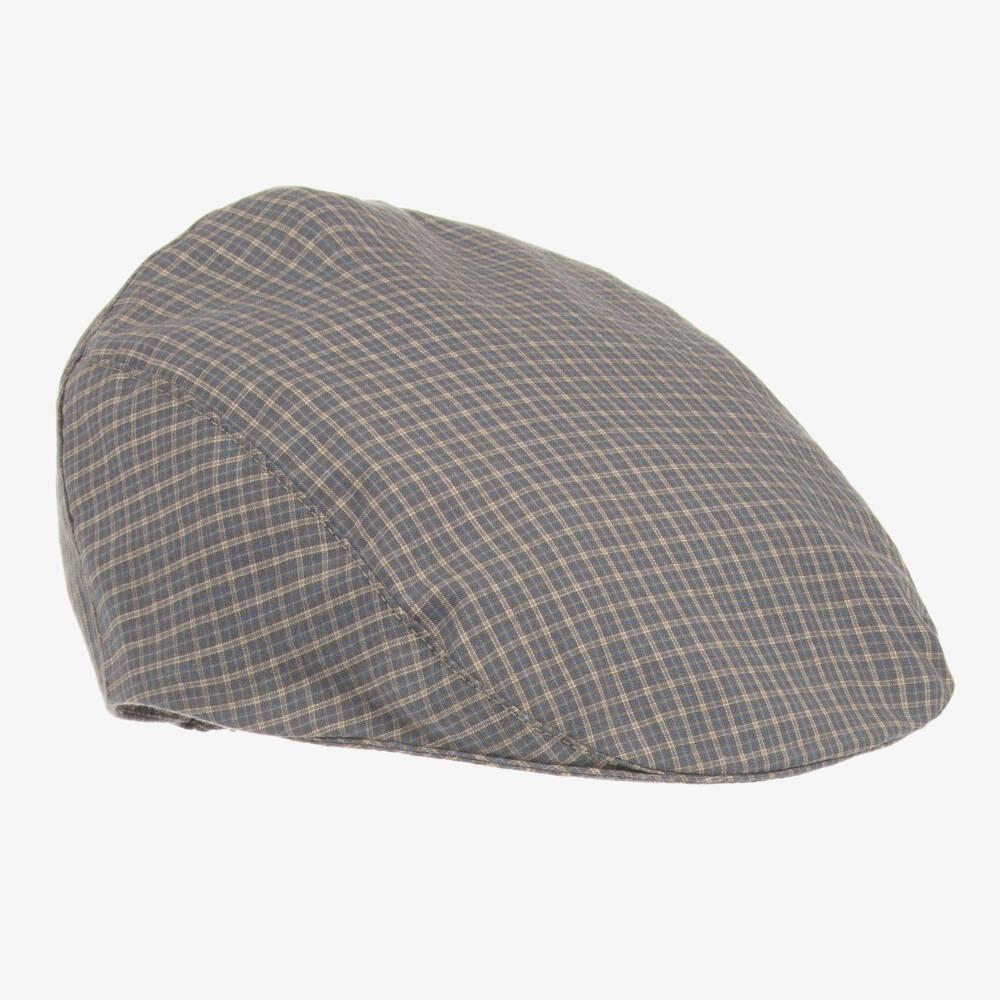Grey-blue flat cap for boys by Jamiks, made in smooth cotton twill. It has a small peak to help keep the sun out of eyes and a checked pattern for a traditional finish. The back is lightly elasticated for a secure, comfortable fit.