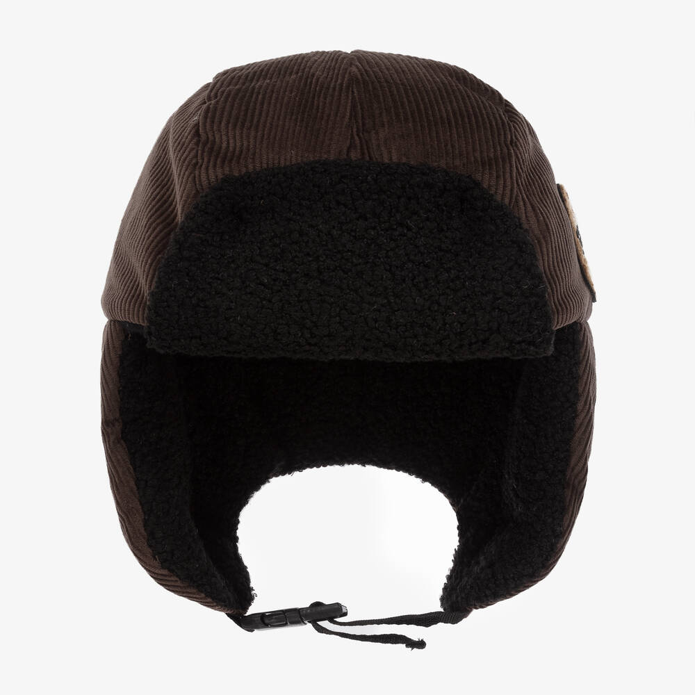 Cosy brown trapper hat for boys by Jamiks, made in stylish cotton corduroy with black bouclé trim. It is warmly padded for protection against the cold, with a soft fleece lining and flaps to cover the ears. A cool teddy appliqué on one side completes the look. It is secured with an adjustable clip under the chin.