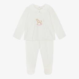 An ivory two piece babygrow for boys by Jamiks, made in super soft, warm velour. The top has a sweet pointed collar and a charming rocking horse motif on the front in beige and pale blue. It fastens on the back with poppers. The matching trousers have a gently elasticated waistband and cosy enclosed feet for an extra snug feel.