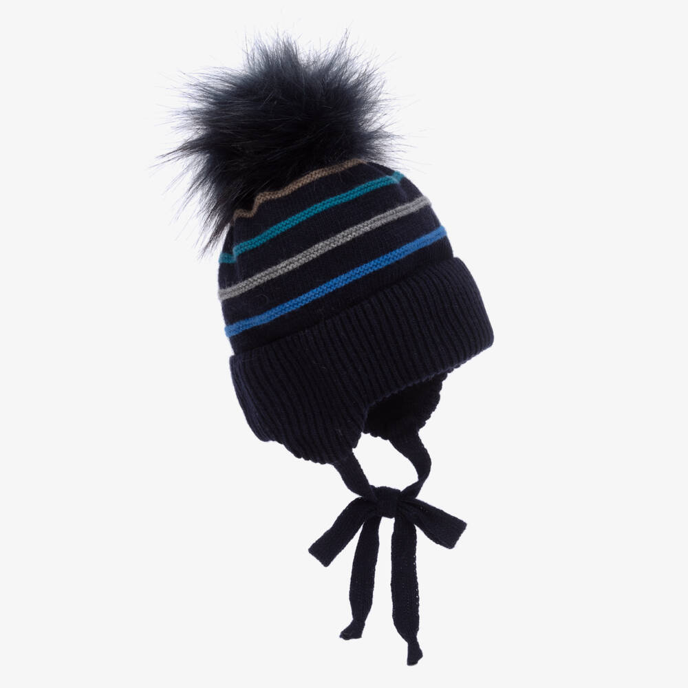 A navy blue hat for boys by Jamiks, with a large tonal faux fur pom-pom on top. Warm and cosy, this striped hat is knitted from a wool and cashmere blend and is lined in soft cotton jersey. It has useful tie fastenings and a pewter-tone branded tab on the ribbed trim for an added designer finish.