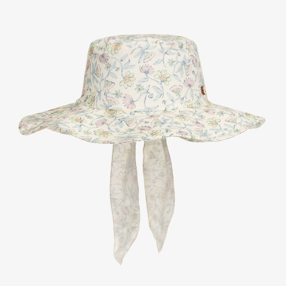 Beautiful ivory sun hat for girls by Jamiks, with a floral pattern in blue, pink and green. Ideal for warm, sunny days, it is made in lightweight organic cotton with a wide brim to shade the eyes. A lovely tie detail at the back adds a feminine finish and an adjustable fit, and there is a decorative floral button on the front.