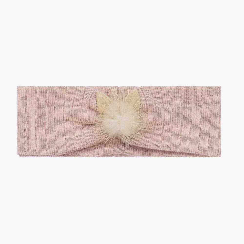 A pink headband for little girls by Jamiks, in a super soft ribbed knit. It has beige petal-shaped decorations with a faux fur pom pom on the front for a cute look.