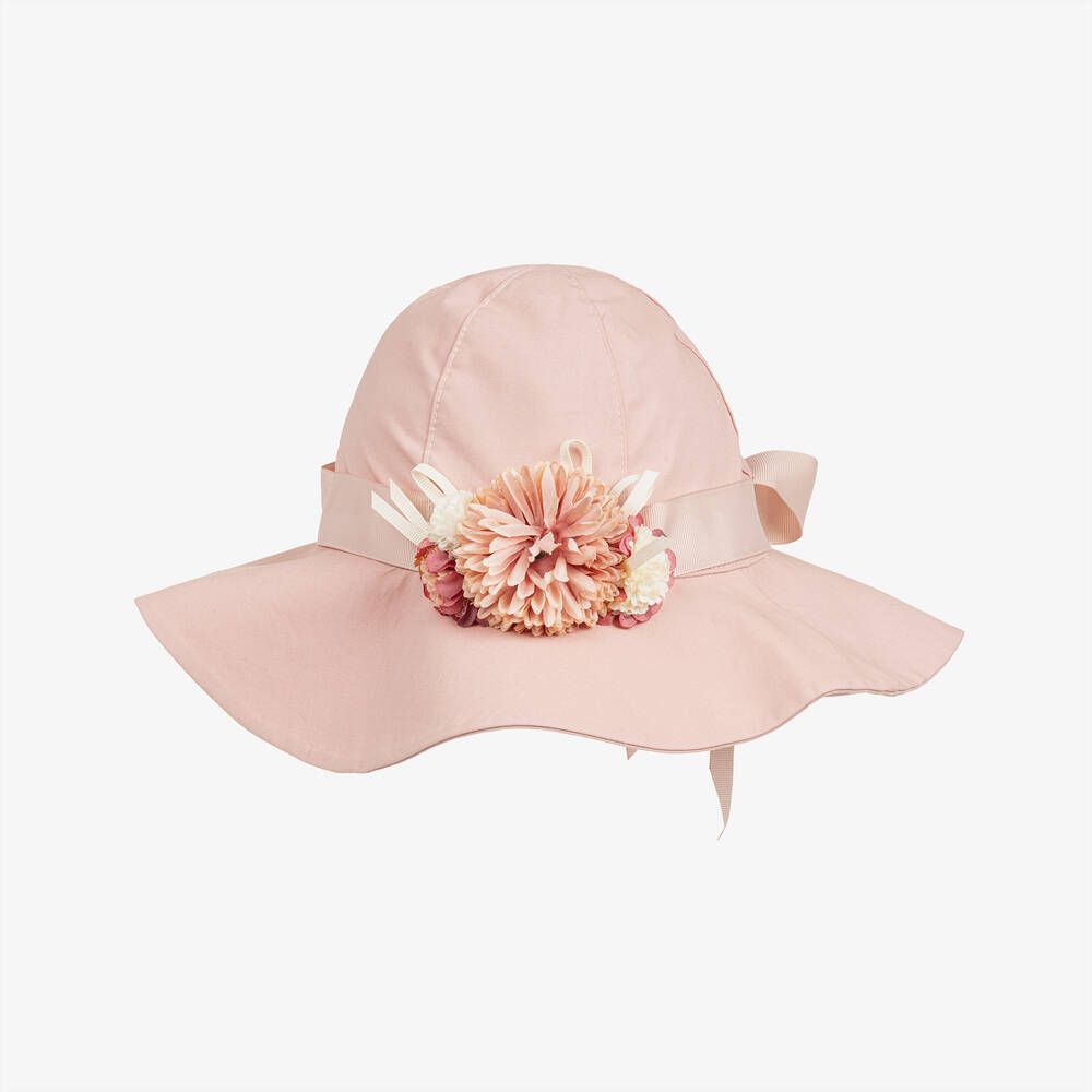 A lovely pink organic cotton sun hat for girls by Jamiks, with a wide brim to shade the eyes. It has a grosgrain ribbon around the crown that ties prettily at the back, allowing an adjustable fit. A decorative floral appliqué in pink and ivory completes the look.