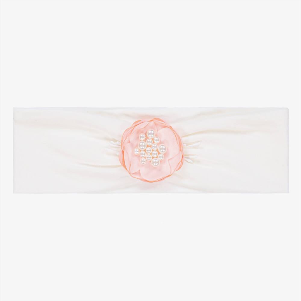 Adorable white headband for girls by Jamiks, made in soft and stretchy jersey cotton for a comfortable fit. The front is decorated with a pretty pink flower embellished with faux pearls for added glamour.