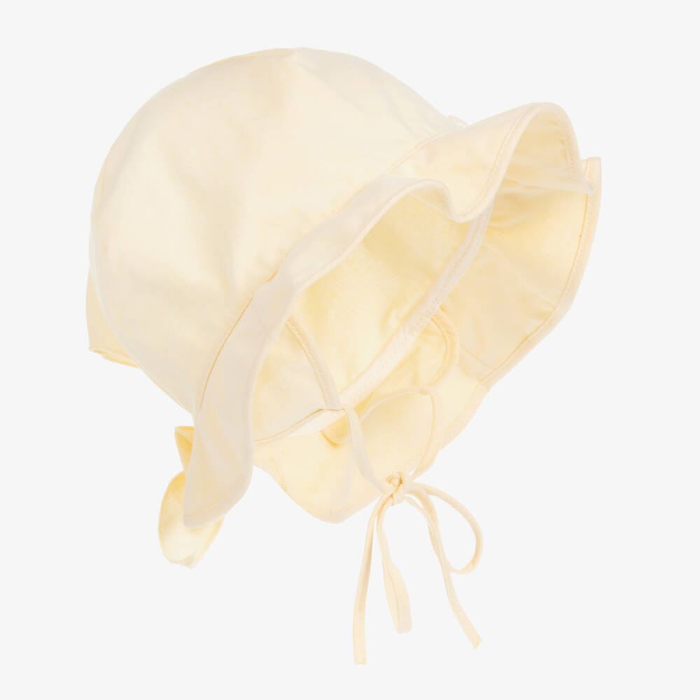 Pale yellow sun hat for younger girls by Jamiks, made in soft and lightweight cotton. It has a cute ruffled brim and a sweet butterfly and flower appliqué on the front, with a bow to tie at the back for an adjustable fit. The hat has narrow fabric straps that fasten under the chin for a secure fit.
