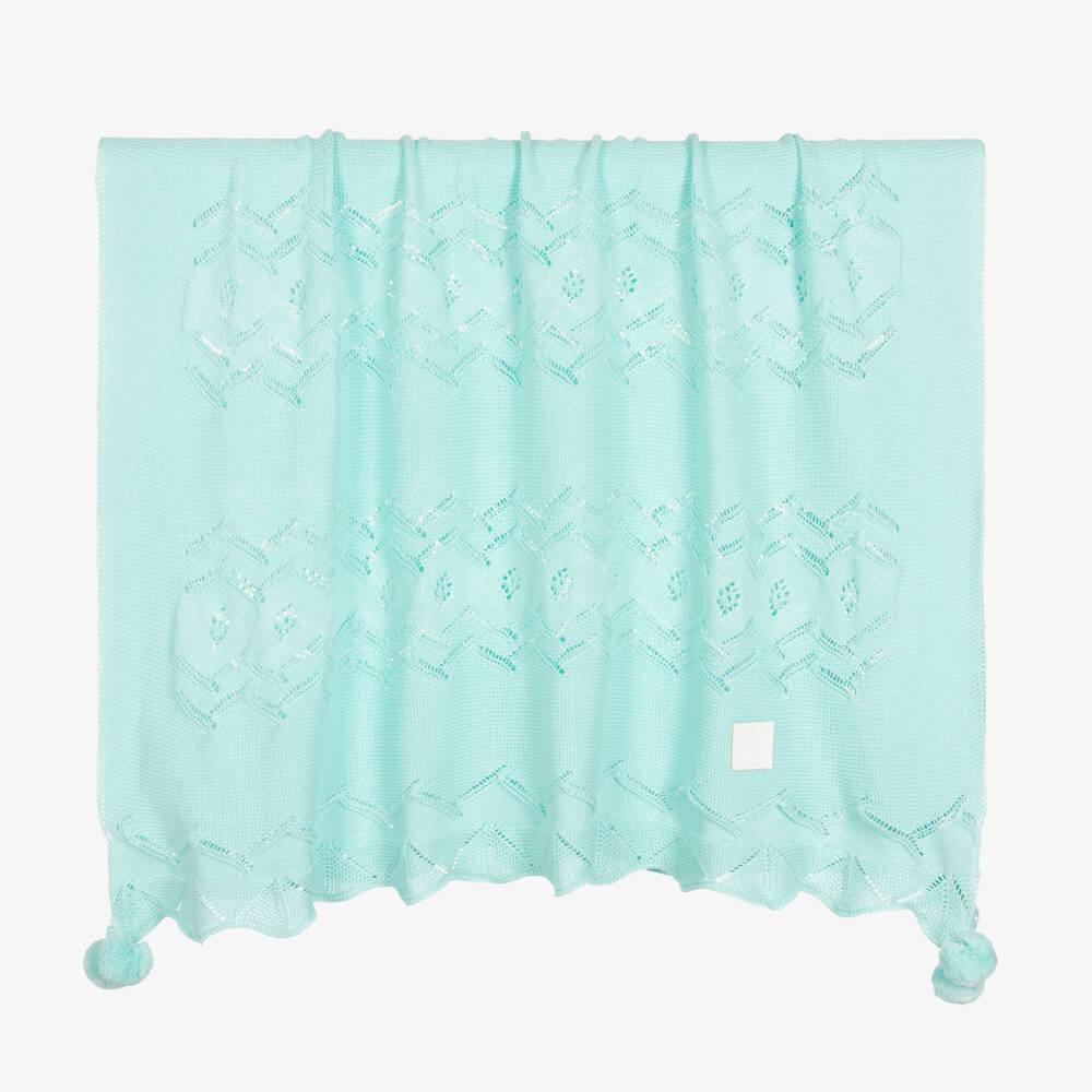 A cute turquoise green blanket, for baby boys and girls, by Jamiks. Loosely knitted in a cotton and bamboo viscose, this blanket is lightweight and breathable, making it the ideal cover for a pram or cot, or as a soft surface for your baby to play.