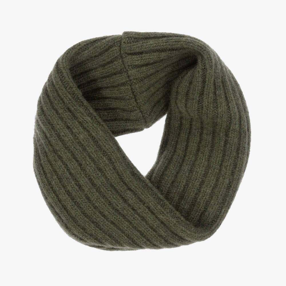 Khaki green snood for boys and girls by Jamiks, made in a soft merino wool blend. Designed in a ribbed knit, this cosy accessory provides extra warmth during those colder months.