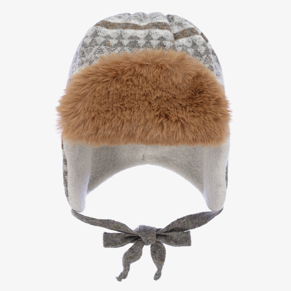 A cosy grey hat for younger boys by Jamiks, knitted in a soft wool blend. Decorated with brown stripes and a geometric pattern, this trapper-style hat has warm ear flaps and long ties to secure under the chin. It has a snuggly cotton fleece lining and a faux fur trim on the front.