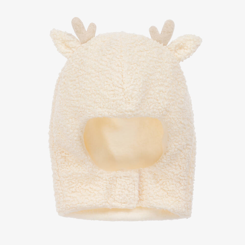 Ivory balaclava for little boys and girls by Jamiks, made in soft bouclé, with a warm, fleecy lining for an extra cosy feel. Ideal for the colder months, it secures on the front with velcro and has little 3D antlers and ears on the top for a cute finish.