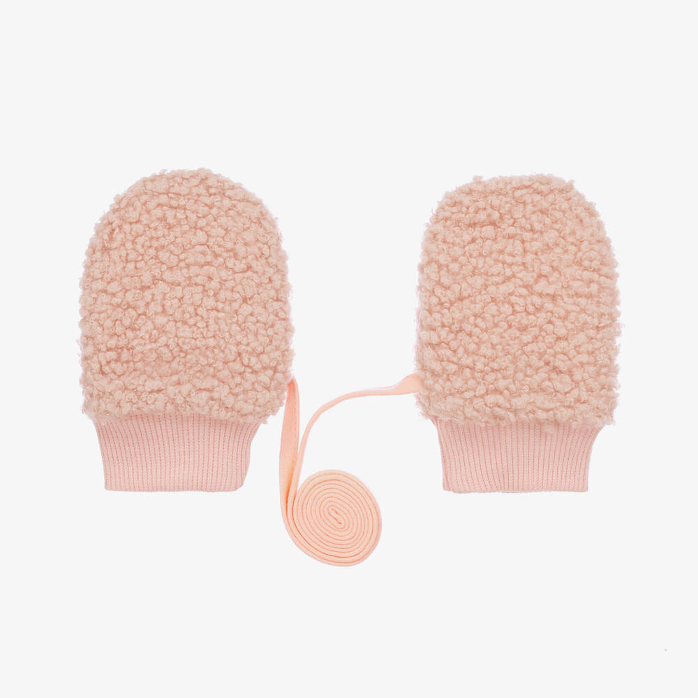 Pale pink bouclé mittens for baby girls from Jamiks. The beautifully soft ribbed cuffs and cotton jersey lining ensure they fit comfortably on tiny hands. The attached strap threads through the sleeves of their coat or jacket to keep the mittens safely together.
