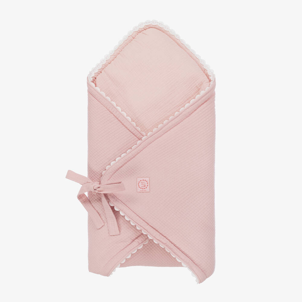 Pink, warmly padded nest for baby girls by Jamiks, with pretty, scalloped lace trims in white. In a wrap-around style, it is made in basket weave cotton, with a soft, organic cotton cheesecloth lining. It fastens with velcro and basket weave ties on one side. On the front is a pink logo badge.