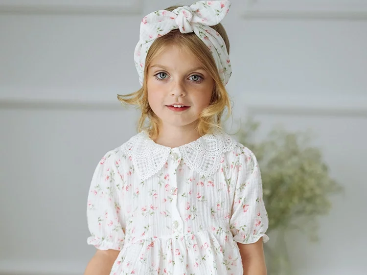 New SeasonJamiksGirls White Cotton Cheesecloth Dress with Pink Rose Pattern