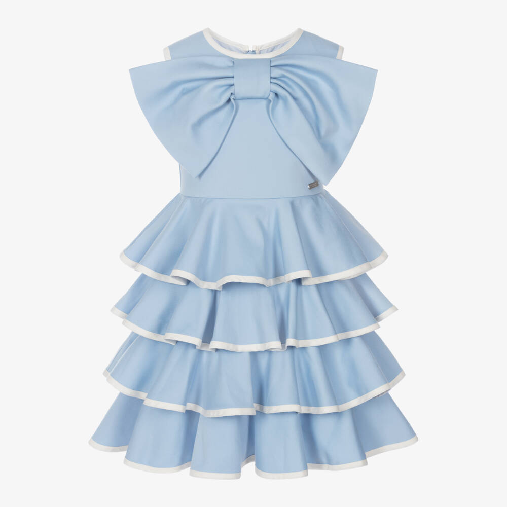 A lovely blue special occasion dress for girls by Jessie and James London, made in a soft cotton and viscose blend. The sleeveless bodice is decorated with a fabulous oversized bow, with a metal logo tag on the waistband adding a subtle designer touch. The skirt is designed in gorgeous ruffled tiers, with contrast trims and a comfortable voile lining. A concealed zip fastening on the back, with an amber button on the skirt overwrap gives the dress a neat finish.
