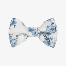 An elegant ivory hairclip for girls by Jessie and James London, featuring a beautiful floral jacquard pattern in green, pink and lilac. The bow is made from soft fabric and is attached to a sturdy metal clip to ensure it stays securely in place.