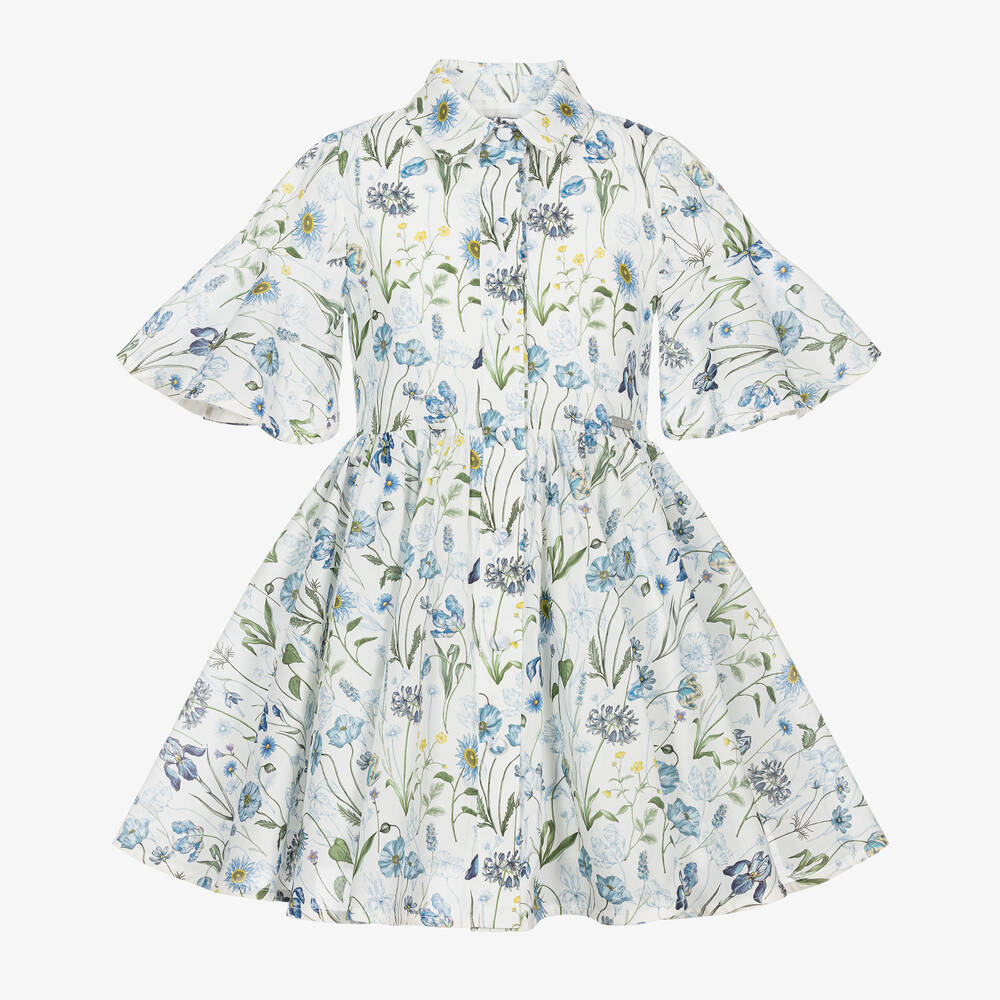 Gorgeous ivory and blue floral dress for girls by Jessie and James London. Shaped with lovely angel sleeves and a floaty skirt, this occasion dress fastens with fabric-covered buttons on the front and is lined in soft cotton for comfort.