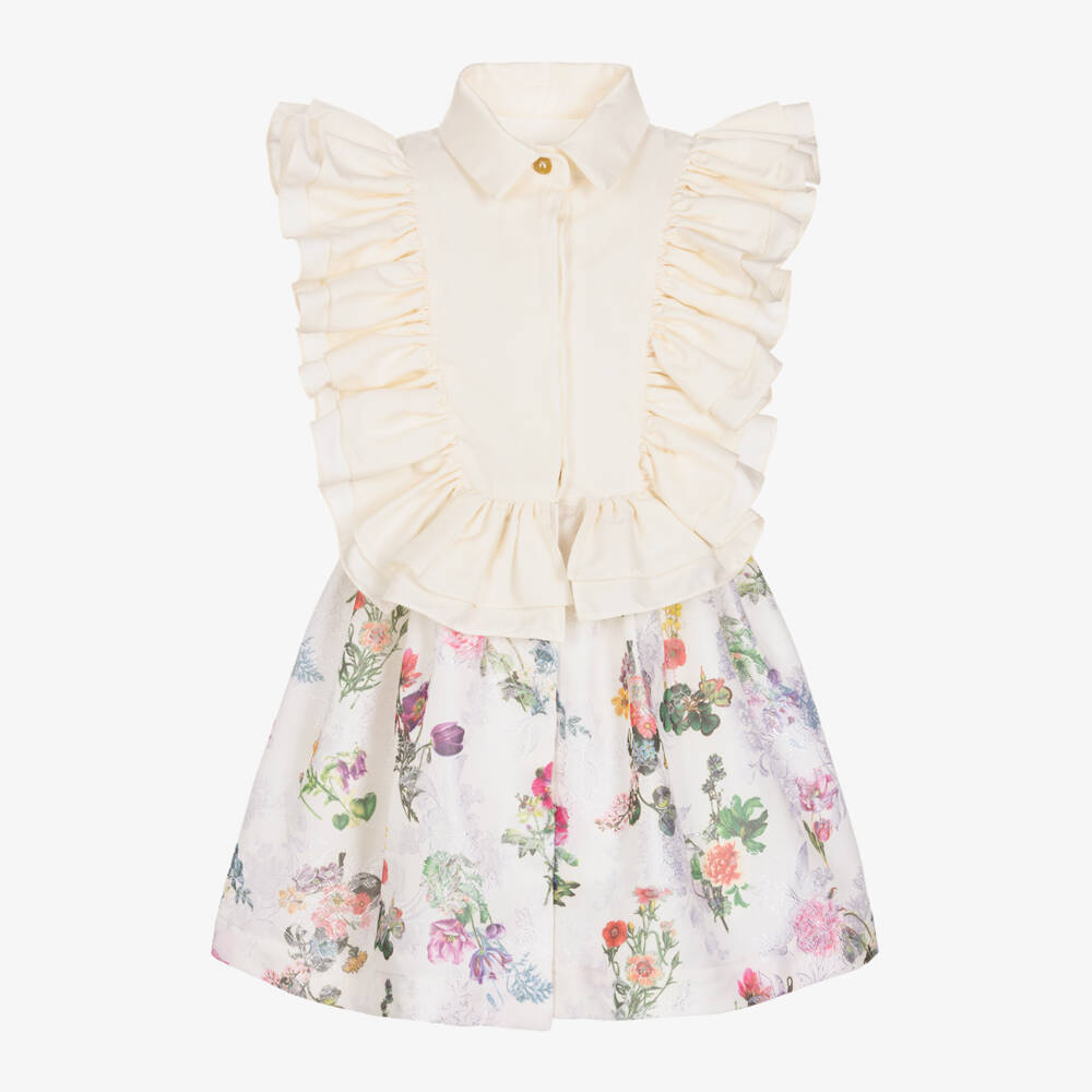 Exclusive to Childrensalon, this ivory shirt dress for girls is by British brand Jessie and James London. Gorgeous for both formal and special occasions, it is highlighted with beautiful ruffles and a romantic floral print. The sleeveless bodice is made in lightweight cotton twill with a classic, pointy collar. Gathered around the waist for a fuller shape, the brocade skirt has a tonal floral pattern amongst the colourful print. It is fully lined in soft cotton voile for comfort and fastens with buttons concealed under the front placket for a neat finish.