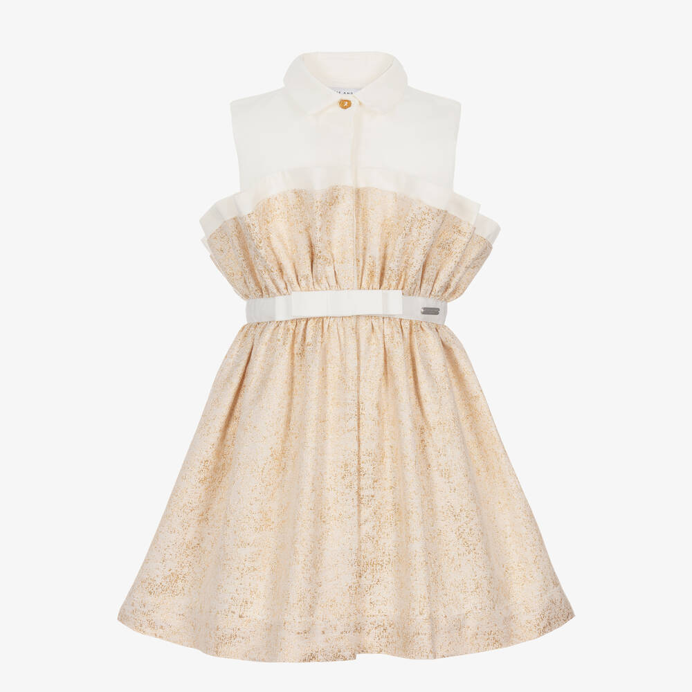 A lovely ivory and gold shirt dress for girls by Jessie and James London. Ideal for a special occasion, this sleeveless design has a smart collared neckline and concealed button fastenings on the front. There are decorative ruffles around the bodice, extending beautifully from the waist to create a distinctive silhouette. The skirt is woven with shimmering gold thread and the grosgrain waist is trimmed with a bow and branded metal plate on the front. A cotton voile lining ensures a comfortable feel against the skin.