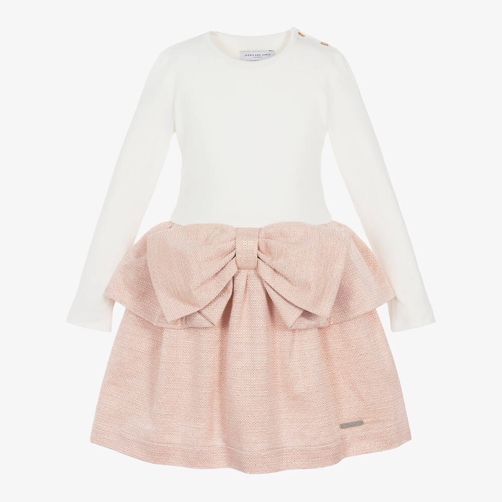 Beautifully combining comfort and elegant styling, this ivory and pink dress for girls is by Jessie and James London. The simple, long-sleeved bodice is made in super soft and stretchy cotton jersey with a crew neckline and branded button fastenings on one shoulder. Woven in jacquard with a delicate sparkle, the full, gathered skirt has a lovely peplum ruffle that forms a statement bow at the front. A lightweight cotton lining completes the style with comfort.