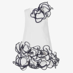 An elegant pastel pink dress for girls by Jessie and James London, with amazing, ruffled 3D floral embellishments on one shoulder and around the hem, trimmed in ivory. Made in a soft blend of cotton and hemp, this design is sleeveless, with a concealed back zip and a lightweight lining for comfort.