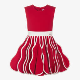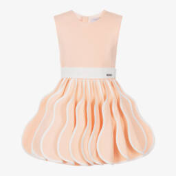 This peach pink occasion dress for girls by Jessie and James London makes a bold statement. Simply stunning, it has a beautifully shaped and structured 3D pleated skirt with striking white trims. The sleeveless bodice is complemented by a neat white waistband, with a metal logo plate adding a signature finish. This elegant style fastens neatly on the back with a concealed zip and is fully lined for comfort.