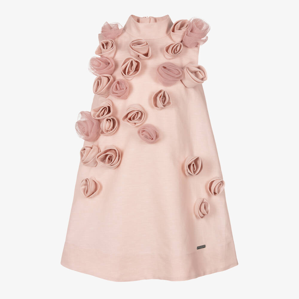 Beautifully chic, this special occasion dress for girls is in a lovely soft pink shade. Elegantly styled with a high neck and a gentle A-line silhouette, it is made in a softly woven cotton and hemp blend, with a comfortable cotton lining. 3D roses in matching fabric and contrasting tulle add a standout touch and the dress fastens with a concealed zip for a neat finish.