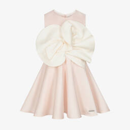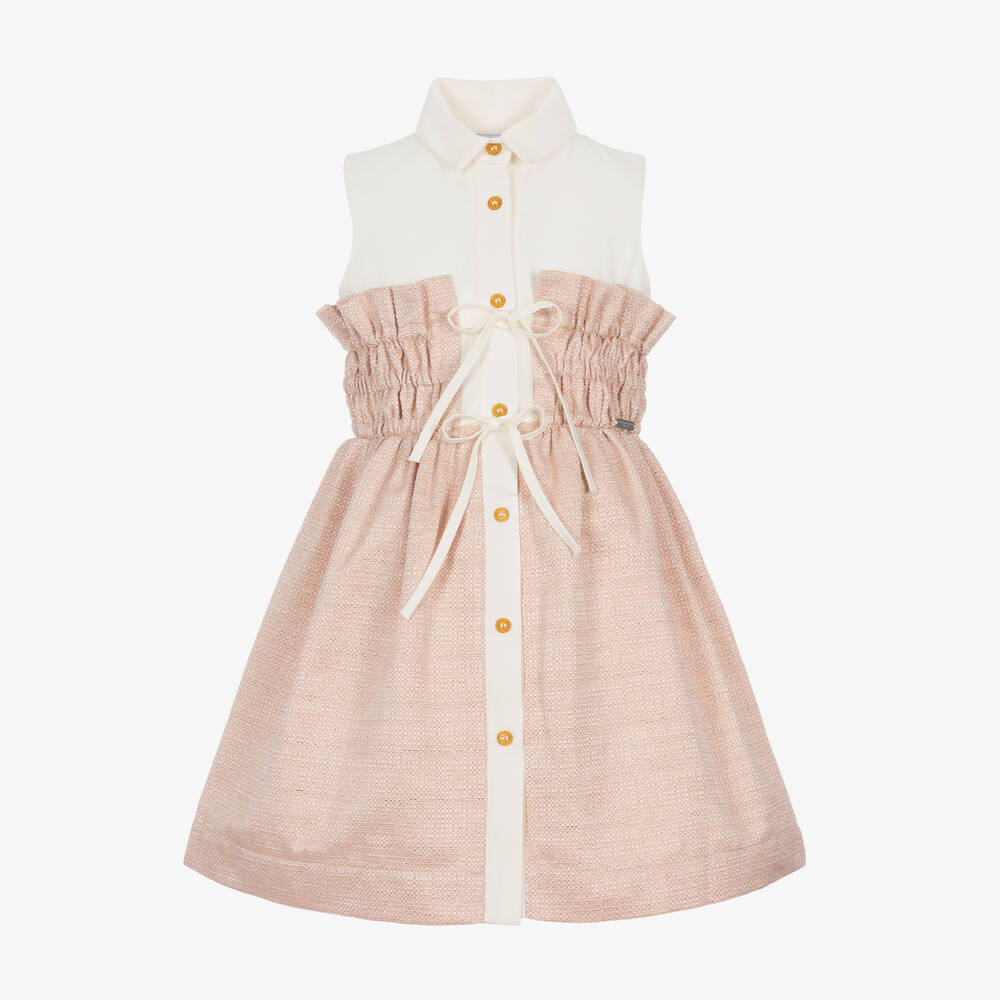 Ivory and pink sleeveless occasion dress for girls by British brand, Jessie and James London. In a chic shirt style, the cotton twill bodice has a smart collar and branded button fastenings which continue to the hem. The high-waisted skirt is made in pink tweed fabric, woven with metallic thread for a shimmery touch. The waistband is ruched, with adjustable tie fastenings and a metal logo badge on one side. Soft ivory cotton lines the dress for a comfortable finish.