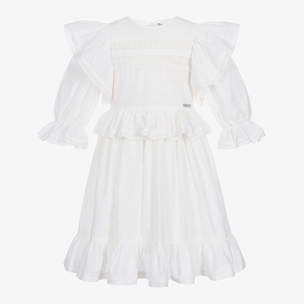 Understatedly elegant, this white dress for girls is from British brand, Jessie and James London. Made in soft cotton voile with a delicate drape, it has intricate embroidered panels, with ruffled trims and voluminous puff sleeves. A silver logo plaque is featured on the bodice for a branded finishing touch. There is a concealed zip fastening on the back, and a luxuriously smooth lining for comfort.